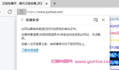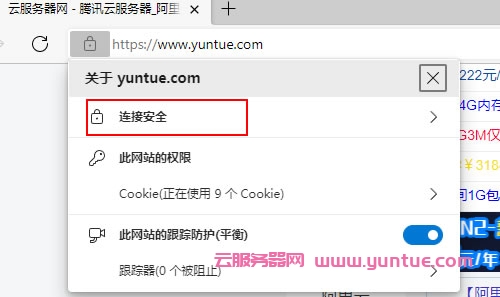 如果要用Microsoft edge浏览器查看当前网站使用的SSL证书品牌,则可按照以下步骤进行操作。本文以查看本站点(https://www.yuntue.com/)所使用的SSL证书品牌为例。