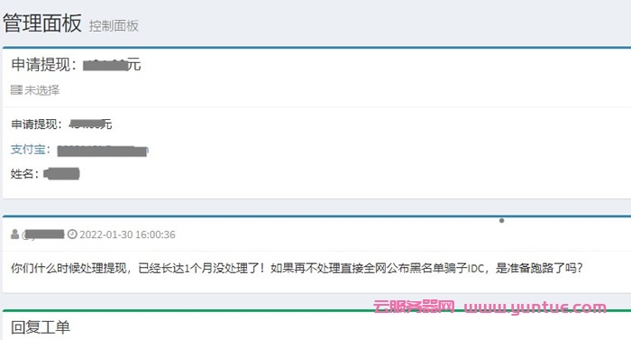 目前,站长给修罗云推广出434元佣金,准备后台申请提现,结果长达一个多月未处理工单,疑似站长失联,很多站长机器出了问题也找不到人处理问题,不处理直接全网公布黑名单骗子IDC,是准备跑路了!