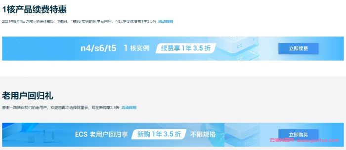 2021年9月1日之前已购买1核t5、1核n4、1核s6 实例的阿里云用户,可以享受续费包1年3.5折,在本活动页购买云服务器ECS产品的新用户可享受1次续费权益,3.5折续1年