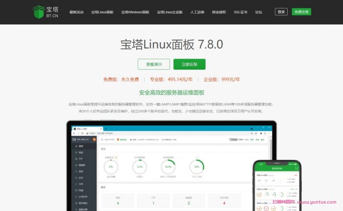 宝塔Linux面板是一款提升运维效率的服务器管理软件。支持一键LAMP/LNMP/集群/监控/网站/FTP/数据库/JAVA等100多项服务器管理功能。