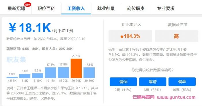 云计算工程师目前是很多企业的刚性需求,为什么这么说呢,因为企业上云可以极大地节约企业成本,稍后我们会给大家分析,目前云计算工程师待遇怎么样呢?下面数据来自职友集,采集数据以北京地区为准,那么在北京云计算工程师平均工资为20170元/月,下方为具体图表: