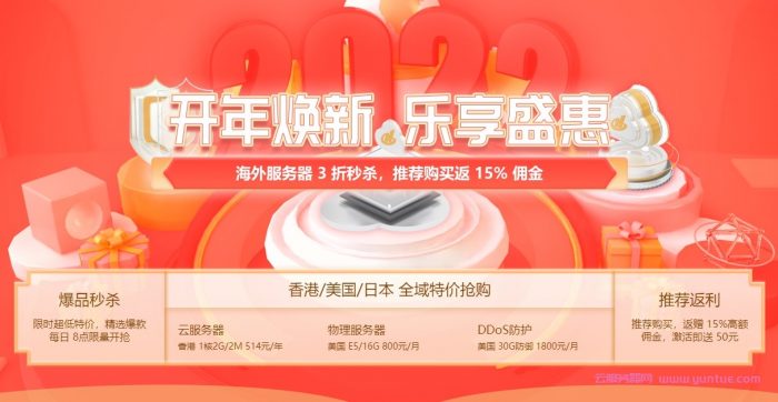 恒创科技针对新老用户推出了2022开年焕新,乐享盛惠,海外服务器3折秒杀_海外云服务器低价抢购,香港云服务器1核2G/2M 514元/年,美国物理服务器E5/16G 800元/月,美国DDoS防护30G防御 1800元/月。限时超低特价,精选爆款 每日 8点限量开抢;推荐购买,返赠15%高额佣金,激活即送50元。