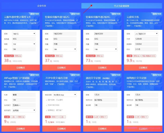 新人首购专区:新用户首购低至 0.4 折,企业新用户享高配优惠,购买 AI 产品赠品类折扣券!包括云服务器、域名、文字识别、AIPage 智能门户等产品。其中.top/.xyz 域名低至 1 元,文字识别,1 万次调用量,1 年有效期,仅需 1 元。