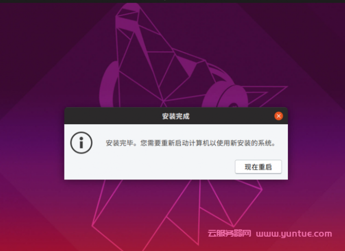 8.好了,系统到此完成安装,移除 Ubuntu 安装媒体后,单击「现在重启」完成安装。