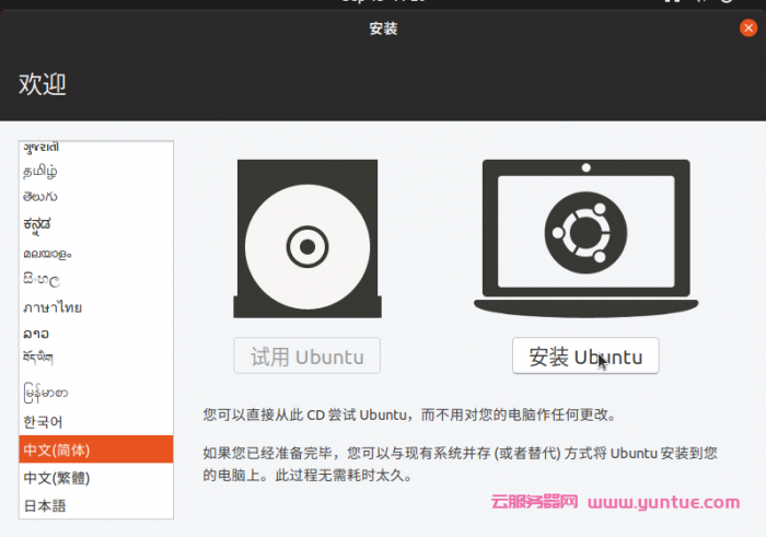 1.选择中文语言,点击「安装 Ubuntu」按钮进行安装。