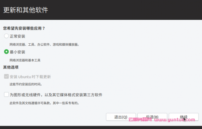 3.「正常安装」将安装所有应用程序,主要包括浏览器、办公套件和媒体播放器。 「最小安装」将只安装浏览器和基本实用程序。推荐选择「最小安装」。