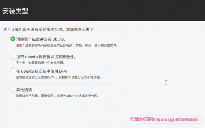 4.由于是新安装系统选择,第1项“清除整个磁盘并安装 Ubuntu”。 如果需要手动对硬盘进行分区安装,可以选择第4项“其它选项”。
