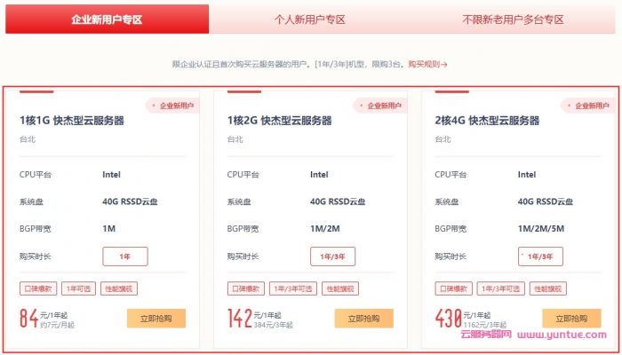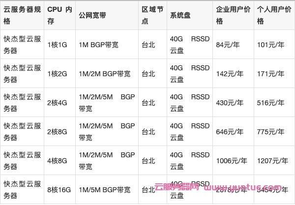 中国台湾台北云服务器不用备案,免备案服务器不只是中国香港,也可以试试Ucloud台北服务器。目前各大云厂商的香港云服务器活动越来越少了,Ucloud台北地域的快杰型云服务器活动后价格还是很便宜的,企业用户和个人用户均可购买,云服务器配置及报价如下表: