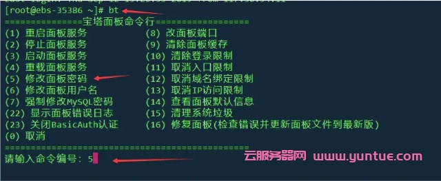 如果是宝塔面板6.X以上版本,就更简单了。因为宝塔面板6.X中内置了命令:bt,所以我们用ssh工具连接服务器,然后输入“bt”即可,输入命令bt之后输入5,便可以添加宝塔面板登录的新密码。如果用户名也忘记了,输入的命令数字是6。