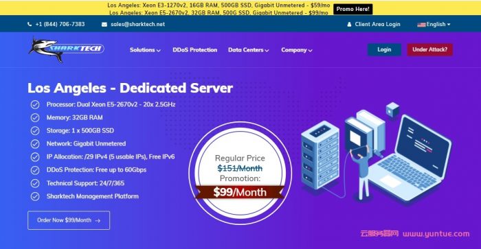 Sharktech本月促销机型商家在原有洛杉矶机房59美元服务器的基础上再推出一款99美元/月产品,更高CPU和内存,1Gbps不限流量,DDoS高防服务器,支持使用支付宝、PayPal、信用卡、加密货币等付款方式。