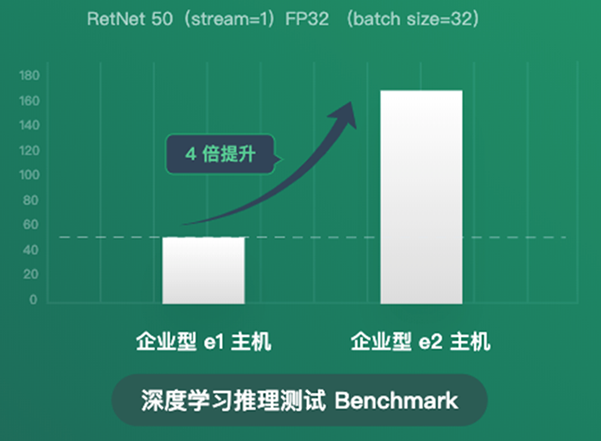 如上图所示,第二代英特尔至强可扩展处理器采用英特尔DEEP LEARNING BOOST矢量神经网络指令(VNNI),提高了人工智能推理训练的表现。与上一代企业型e1主机相比,搭载第二代英特尔至强可扩展处理器的企业型e2云主机在深度学习的多种场景性能提升400%。