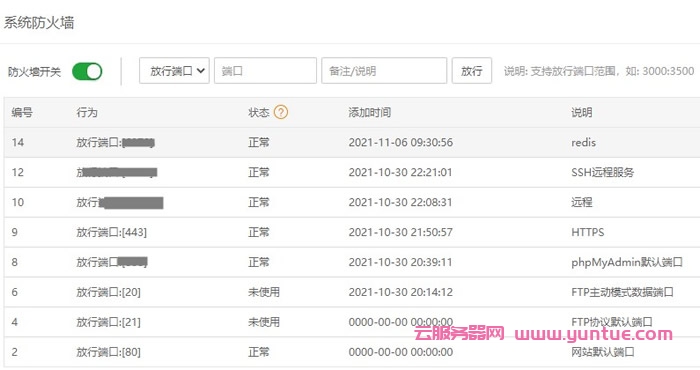 端口放行成功后,我们可以在防火墙列表查看当前端口的运行情况。放行端口状态主要分为未使用、外网不通或正常,下面是每种状态说明: