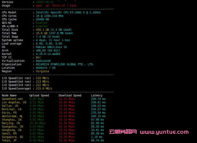 可以看到磁盘I/O在215MB/秒左右,这个性能还是不错的,只有SSD固态才能达到这样的水平。全球各地上传速度都跑满了10Mbps,下载速度跑满20Mbps。从结果来看华纳云这款新加坡服务器性价比还是相当不错的,提供了3个IP、无限流量,比同行业中很多家新加坡服务器都要划算。