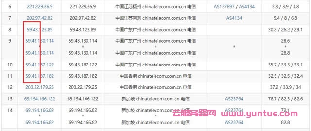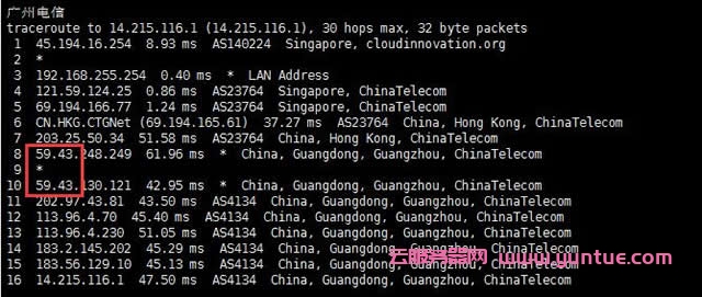 可以看到电信回程经过香港节点,并且回程也是走了59.43的CN2线路。