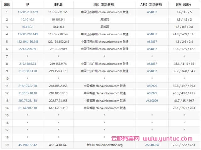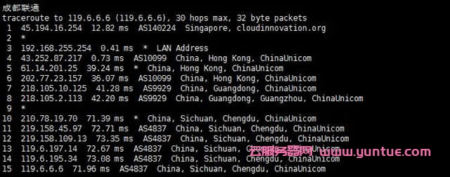 联通去程路由也是经过香港节点后直连新加坡机房,并且走的是AS4837线路,然后转AS9929线路。