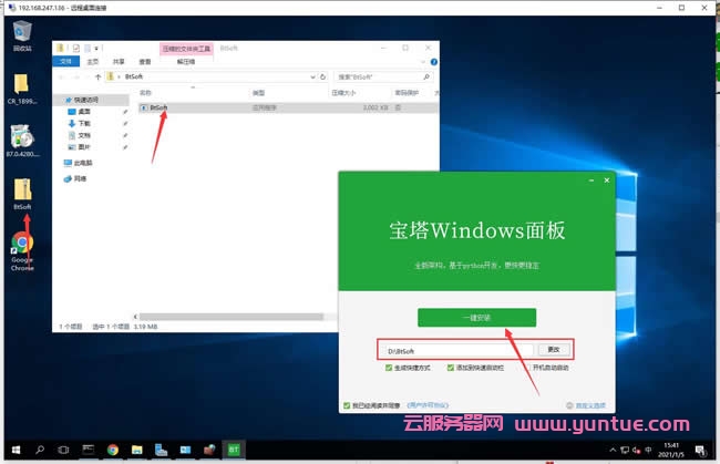 2、下载到命名为BtSoft.zip的压缩包后,双击打开,会看到一个BtSoft.exe的安装程序,再双击安装程序后就出现宝塔Windows面板的安装界面了。可以选择安装到其他盘符,建议用户如果有D盘的话将面板程序安装在D盘,这样就算是系统损坏无法进入系统了,只需要重装系统(一般重装可以选择只格式化C盘保留其他数据盘),D盘数据还在的哦。