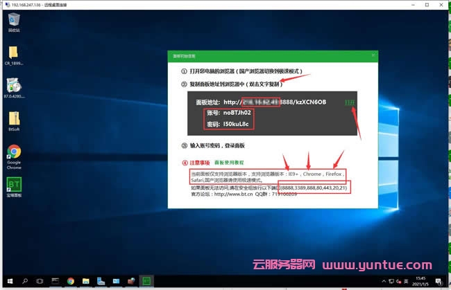 4、面板首次安装完成后,会有初始面板信息的提示。(如图):
