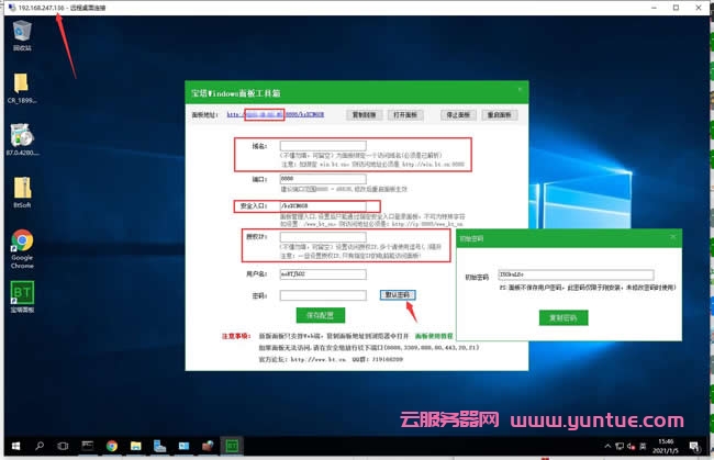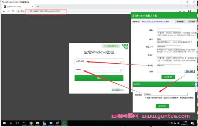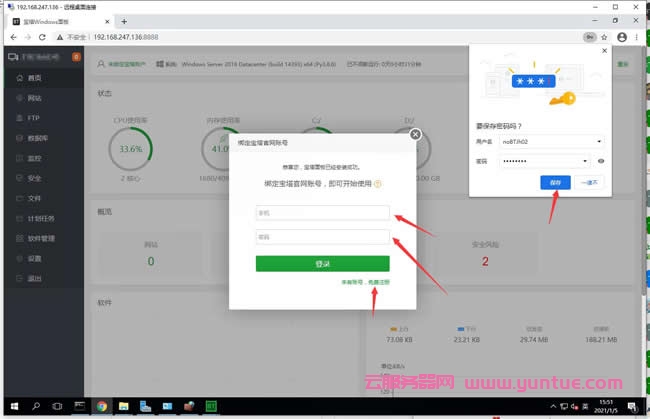7、将面板工具箱中显示的初始用户名以及默认密码复制到浏览器中,点击登陆即可进入到宝塔Windows面板的首页。