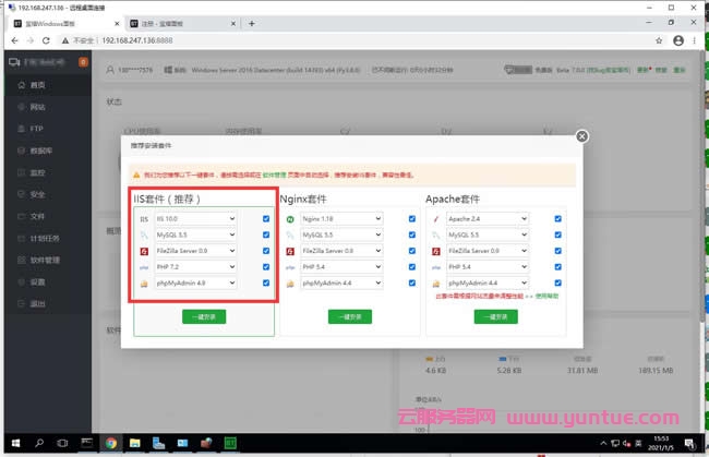 8、绑定完宝塔宝塔账号后,会提示推荐安装的环境套件(WIMP/WNMP/WLMP),根据自己的实际需求进行选择。既然已经选择了Windows的话推荐安装IIS套件。