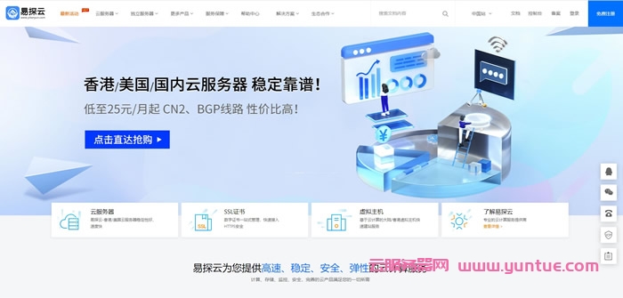 易探云怎么样?易探云成立于2017年,香港YiTanCloud Limited网络服务品牌,香港NTT Communications合作伙伴,数十年云计算行业经验。YiTanCloud Limited提供源自香港、美国等地骨干级机房优质资源,包括BGP国际多线网络,CN2点对点直连带宽以及国际顶尖品牌硬件。易探云服务器采用Intel E5系列CPU、DDR3/4内存 高速固态SSD,高性能IO和低延迟多样化CN2/BGP线路满足您的多样性业务需求。 稳定、安全、弹性、高性能的云端计算服务,实时满足您的多样性业务需求!