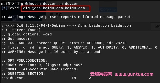 同样在cmd命令界面,输入nslookup www.yuntue.com来查询云服务器网的IP地址,或是www.baidu.com查询百度IP。