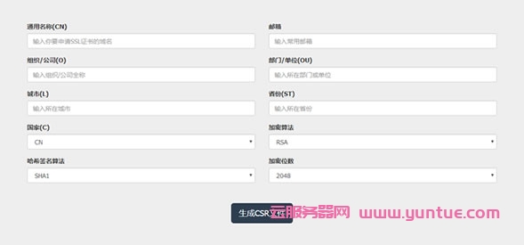 生成CSR通常需要填写要申请证书的域名(如果我们想在提交证书申请时使用该CSR,必须确保证书绑定域名包含此处设置的域名。例如:我们在此处设置域名为yuntue.com,则证书申请中的证书绑定域名必须包含yuntue.com,才可以匹配到该CSR)、选择SSL证书对应的联系人信息(包含姓名、手机号码等)、选择SSL证书对应的公司信息(包含名称、电话等)等。