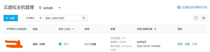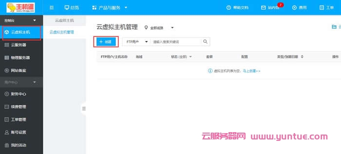 4、实名认证完毕后,即可在后台创建免费空间。在后台左侧菜单栏点击云虚拟主机按钮,进入云虚拟主机管理页面,并点击创建按钮。