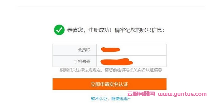 2、填写正确信息提交后,系统将提示注册成功。在注册成功的页面上点击立即申请实名认证按钮,将进入后台的实名认证页面。