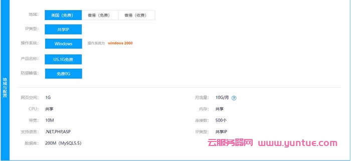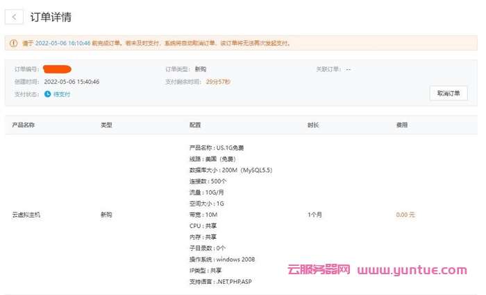 5、在跳出的创建云虚拟主机页面选择需要的云虚拟主机,这里以美国免费云虚拟主机为例,点击确认购买。这里会跳转到订单详情页面,因为价格是0元,点击确认支付即可开通成功。