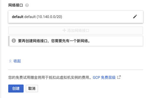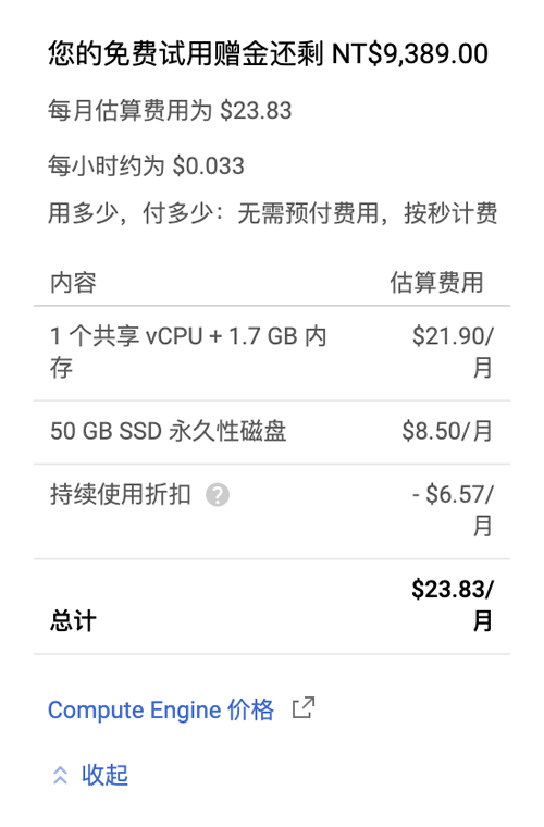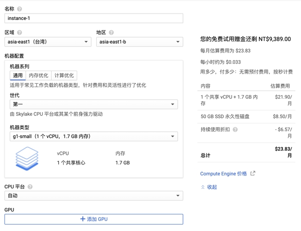 填写名称,选择区域,机器类型等内容,右侧会显示每月的费用,注意累计费用不要超出赠金总额。推荐选择 1 个共享 vCPU + 1.7 GB 内存。