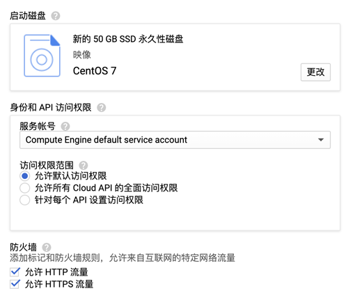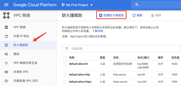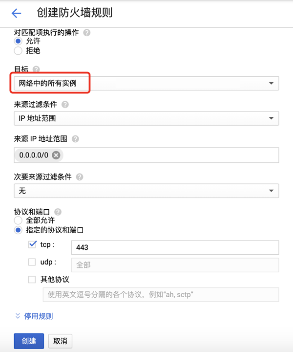 创建防火墙规则,需要注意的是,目标一栏选择“网络中的所有实例”,不然外网无法访问。