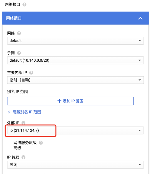填写网络接口信息,外部 IP 选择固定 IP。