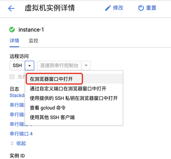 点击实例名称,在虚拟机实例详情页面“远程访问”选择 SSH,并在浏览器窗口中打开。