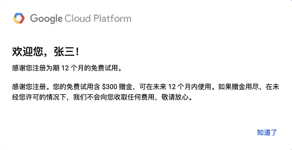 填写完上述资料后,点击“开始免费使用”按钮,便提示已成功注册。获得 300 美元的赠金,一年内有效,而且承诺如果赠金用完,不会主动扣费。
