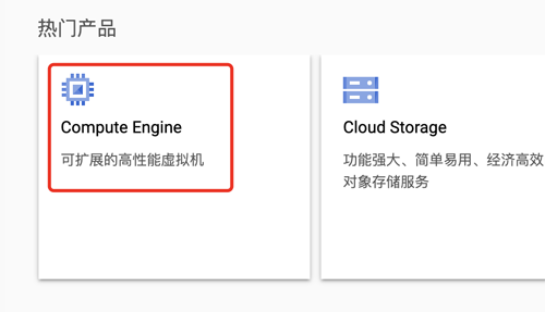 点击菜单中的 Compute Engine,或者直接点击热门产品栏中的“Compute Engine” 。