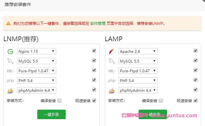 2、宝塔面板安装成功后,登录到后台管理界面。第一次登录进去,页面会弹出安装环境我们可以选择LNMP(即Linux+Nginx+MySQL+PHP)或者LAMP(即Apache+Nginx+MySQL+PHP)进行安装。LNMP和LAMP环境主要的区别在于Web服务器上面,一个使用是Apache服务器、一个使用Nginx服务器,具体可根据网站需求来搭建合适的环境。