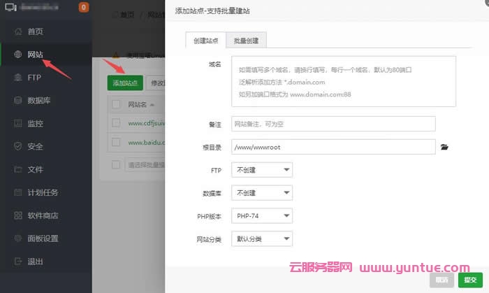 4、宝塔面板支持创建单个站点,或批量创建站点。填写以下信息,添加一个新的网站。