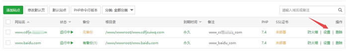 5、如果要对网站进行SSL证书、重定向、伪静态、访问限制、子目录绑定等设置,则可点击对应站点的操作栏中“设置”链接,进入站点修改页面。