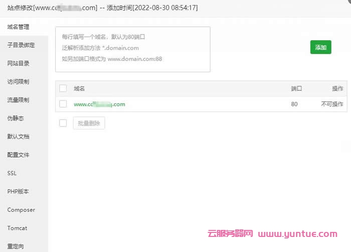 注意事项:添加站点绑定域名第一个域名不能为泛域名,域名默认绑定为80端口。