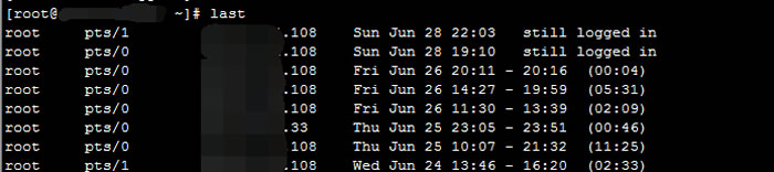 通过远程连接登录Linux服务器,使用root用户执行last命令,系统会列出最近的登录记录。