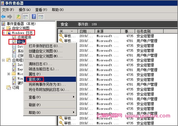 2、单击 Windows 日志,选中 安全 并右击,单击 查找,打开 查找 框。
