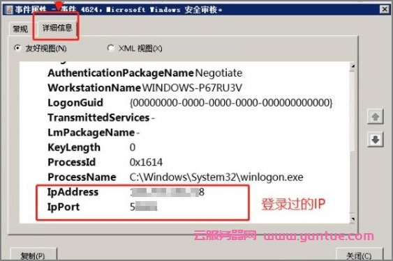 2、双击查找到的事件,单击 详细信息,查看 IpAddress 字段和 IpPort 字段信息。