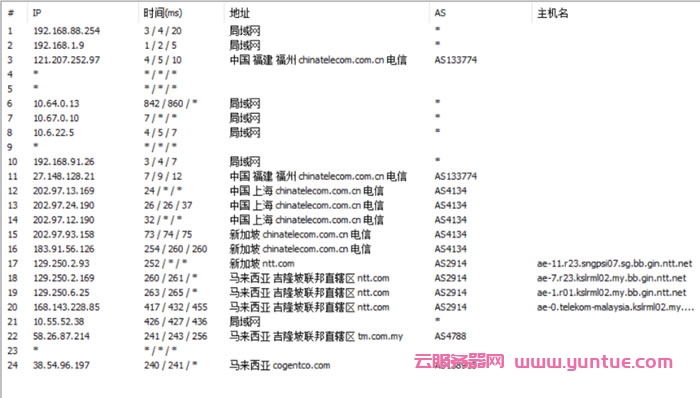 萤光云可以试用,并且承诺五天内可以无责任全额退款,我就开了一台测试。首先我们用best trace测一下萤光云马来西亚vps的线路情况。可以看出,这家马来西亚vps在上海国际出口后到新加坡,然后直接就到了马来西亚吉隆坡机房,没有绕路。