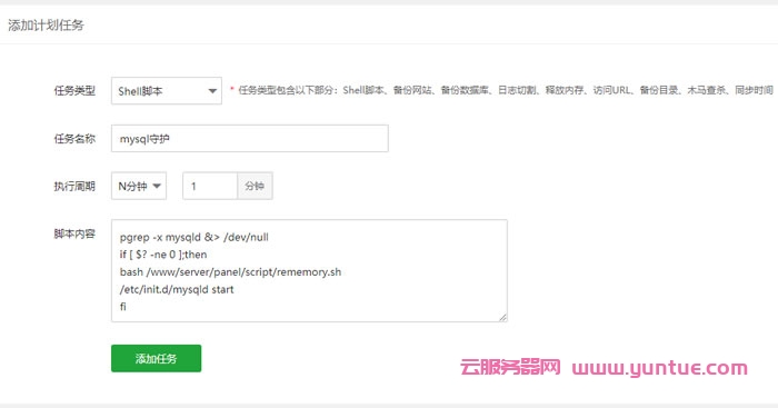 登陆宝塔后台-计划任务-添加Mysql守护,执行周期,可选择多长时间执行一次,比如1分钟监控执行一次,具体的周期请站长根据自己服务器实际情况来设置。