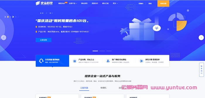 快云科技国庆钜惠活动开始了,年付专区388元/年起,香港CN2 VPS,25.5元/月起,美国cera vps,27元/月起!快云科技是成立于2020年的新进主机商,持有IDC/ICP等证件资质齐全,主营产品有:香港弹性云服务器,美国vps和日本vps,香港物理机,国内高防物理机以及美国日本高防物理机。产品特色:全配置均20M带宽,架构采用KVM虚拟化技术,全盘SSD硬盘,RAID10阵列, 国内回程三网CN2 GIA,平均延迟50ms以下。国内全绿,硬件配置方面采用E5 2696v2 E5 26969V4等 偏中高端硬件大大的提升机器性能和稳定性。并支持LIUNX/windows系统,建站首选。