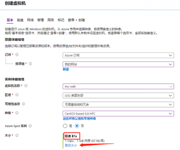 4、创建虚拟机时一定要选择标准 B1s (1 vcpu、1GiB 内存),这个配置,其他不管是高于还是低于这个配置,都不是免费的。