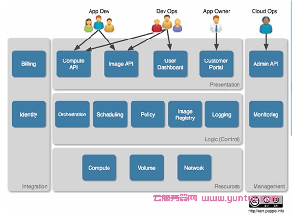 逻辑层:提供云服务的智能控制功能,如:orchestration(负责任务的工作流管理)、scheduling(任务到资源的调度管理)、policy(配额等服务)、image registry(镜像实例的元数据管理)和logging(事件计费管理)。