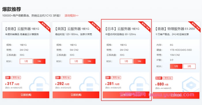 | 日本•云服务器 | 1核1G | 50G(SSD) | 2M(CN2) | 32元/月 | 281元/年(原价¥936) | 链接 |