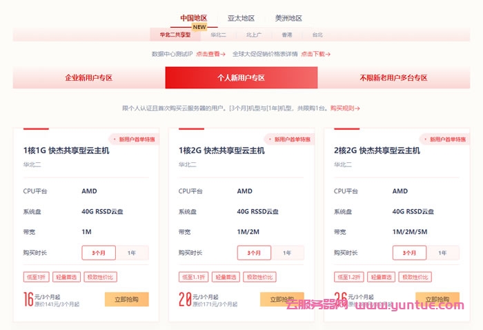 限个人认证且首次购买云服务器的用户。[3个月]机型与[1年]机型,共限购1台。