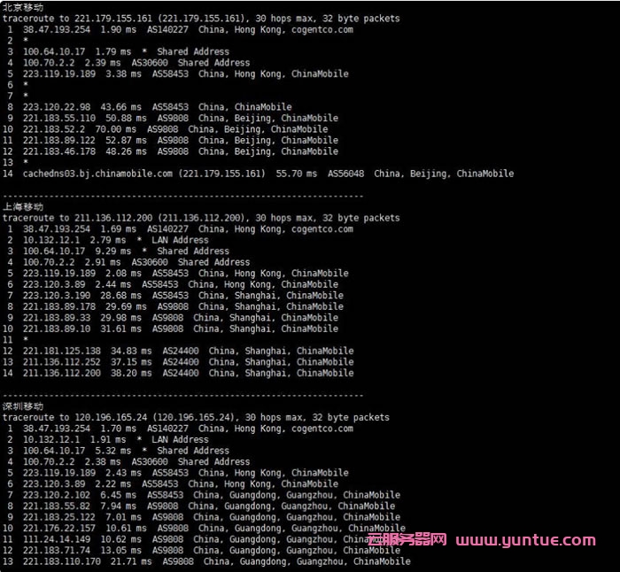 移动回程路由是从北京、上海、广州网口入境,直连内地网络,走AS9808线路。